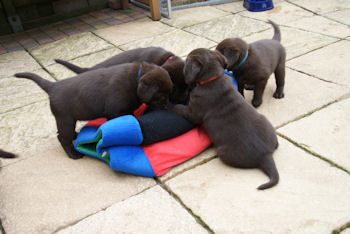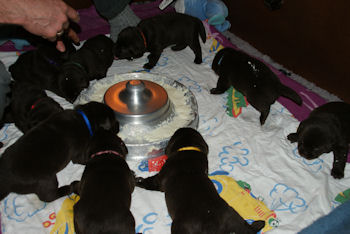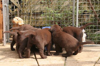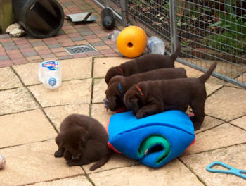 Vandaag zijn de pups alweer 6 weken. Ze eten vier keer brokken en ze vermaken zich prima.