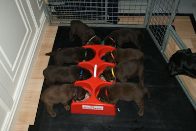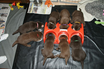 De puppen zijn nu 3.5 week en eten nu vlees wat ze heerlijk vinden. Toch ook nog regelematig drinken ze bij Xena.
