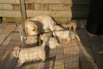 De puppen zijn inmiddels uit de werpkist en de puppieren is hun nieuwe verblijf. Inmiddels krijgen ze vlees en drinken nog bij Amber. Door het hele mooie weer kunnen ze al buiten spelen maar ze vinden het te warm dus dat is meestal maar kort. maar het gaat goed met allemaal.