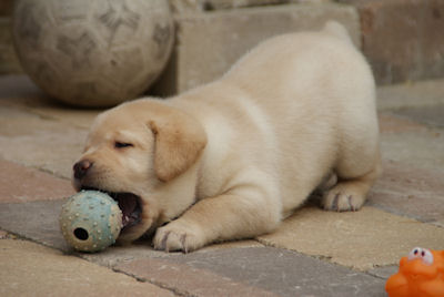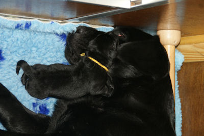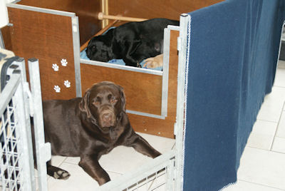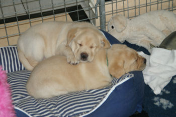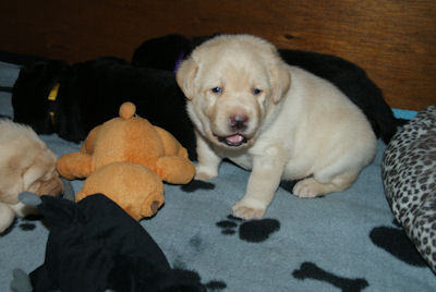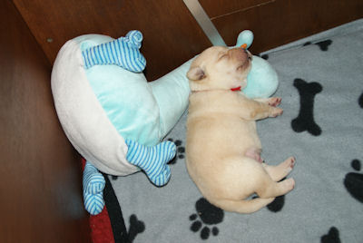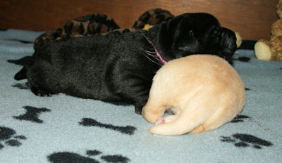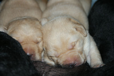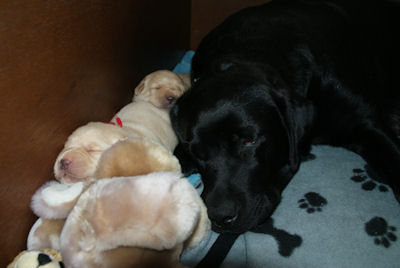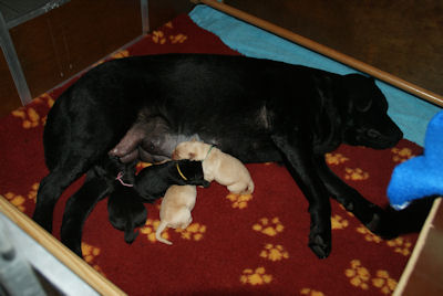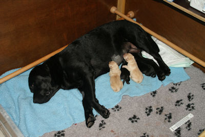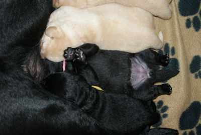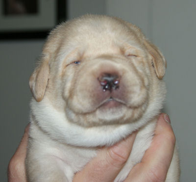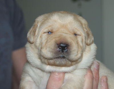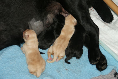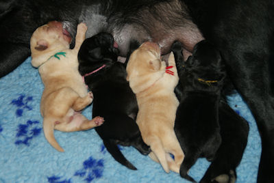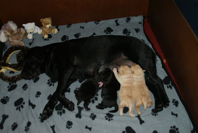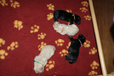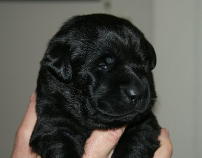 Geboren op 26.3.2010 5 puppies via de keizersnee helaas 1 dood geboren. Het zijn 1 blonde reu, 2 zwarte teven en 1 blonde teef. Moeder en puppen doen het heel goed. De geboortegewichten lagen rond de 500 gram.