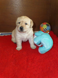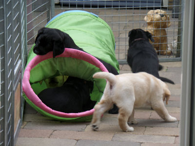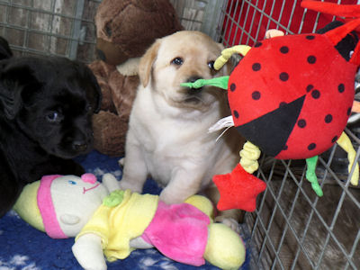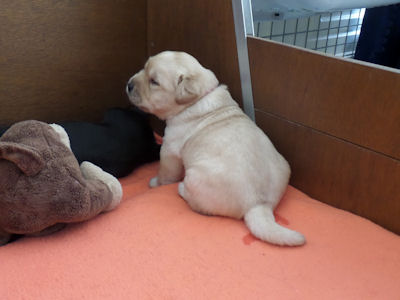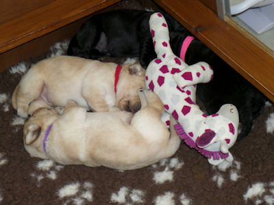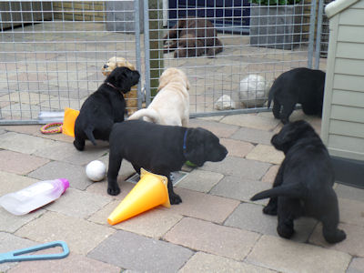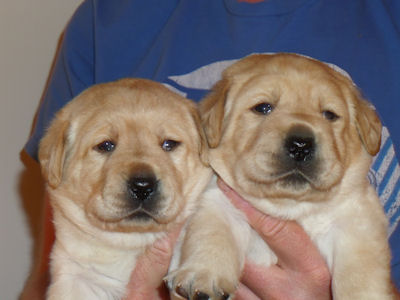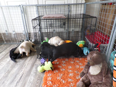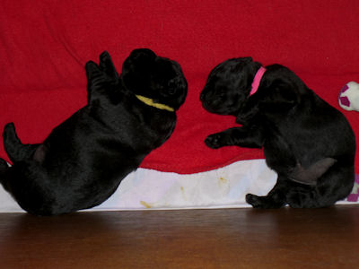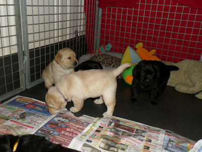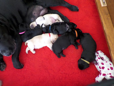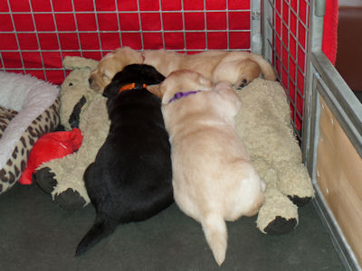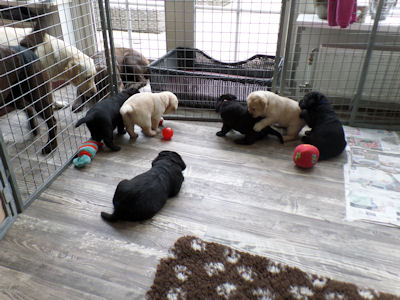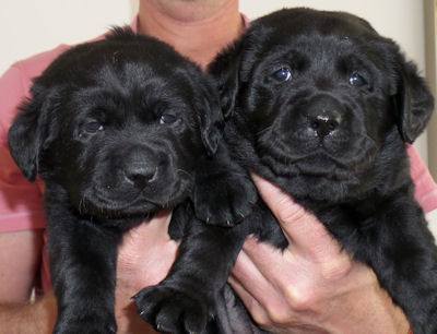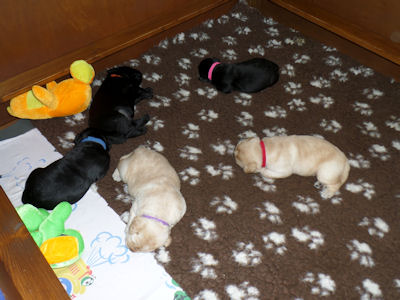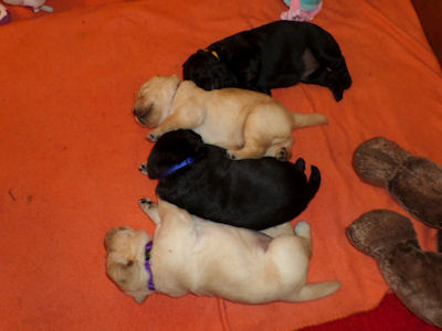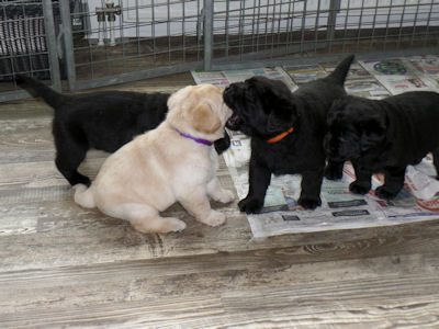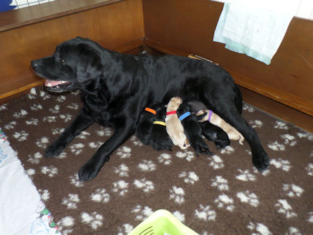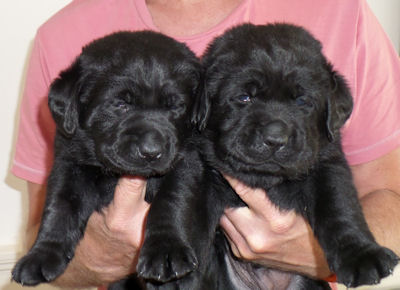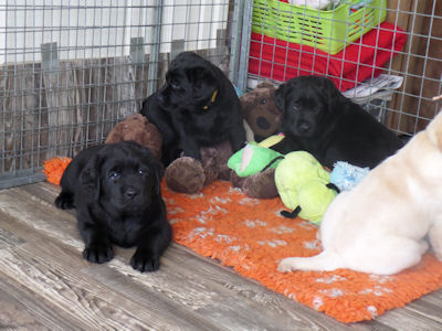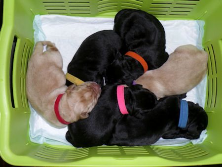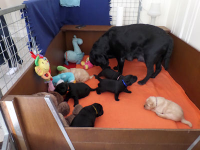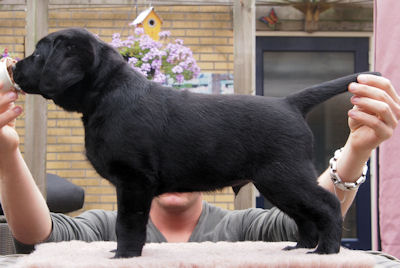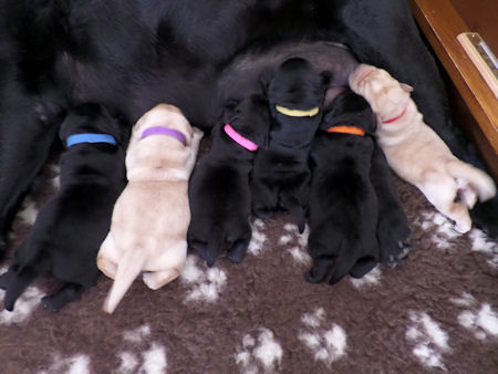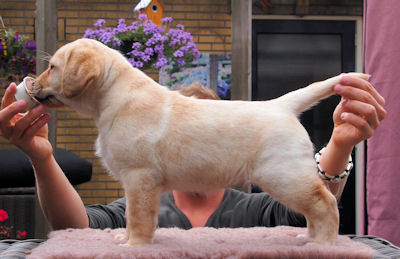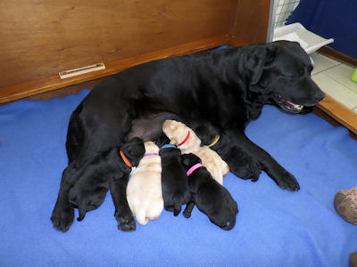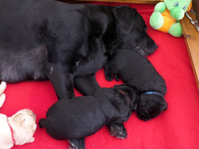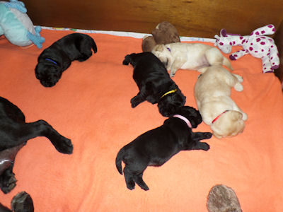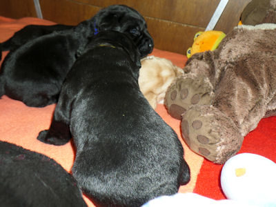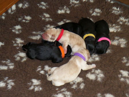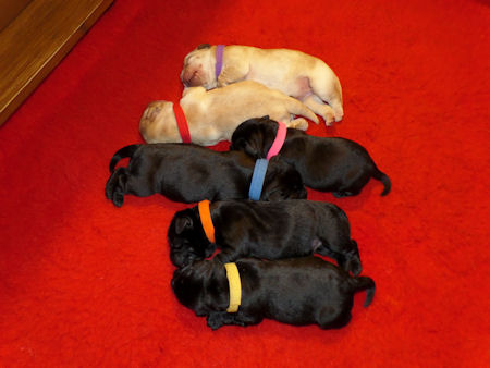 Geboren op 28 April 2015 6 puppies, 1 blonde reu, 2 zwarte reuen, 1 blonde teef en 2 zwarte teven.